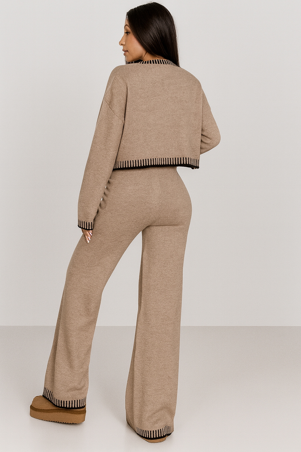 Ge din garderob en modern och elegant uppdatering med detta tvådelade set för höst och vinter. Setet består av en stilren V-ringad topp och matchande byxor i en lös och bekväm passform. Perfekt för resor, vardag, dejter eller shopping – ett mångsidigt plagg som kombinerar både komfort och trend.