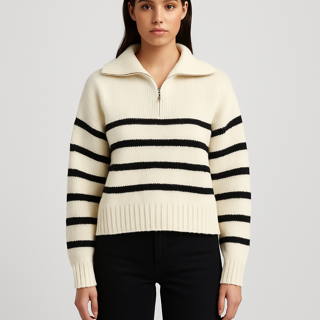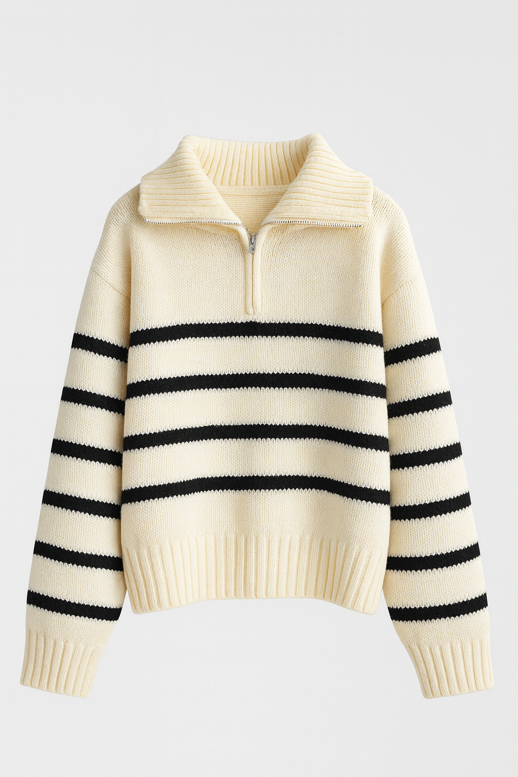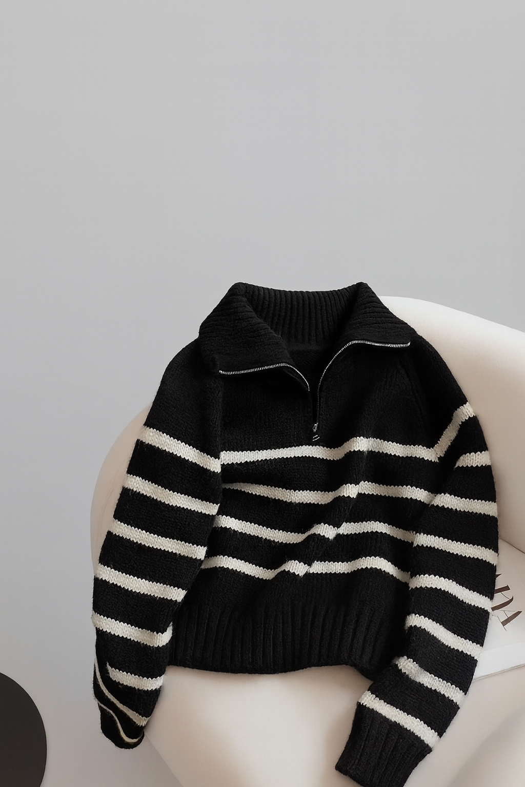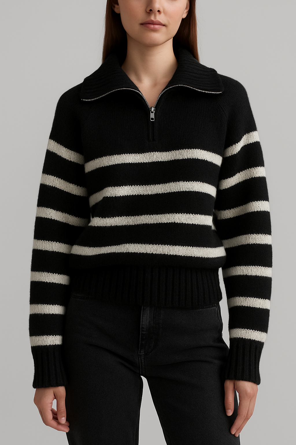 En stilren och mångsidig tröja som kombinerar klassiska ränder med modern komfort. Denna stickade tröja i svart och vitt är tillverkad av ett mjukt, stretchigt material som ger en avslappnad men ändå elegant passform.