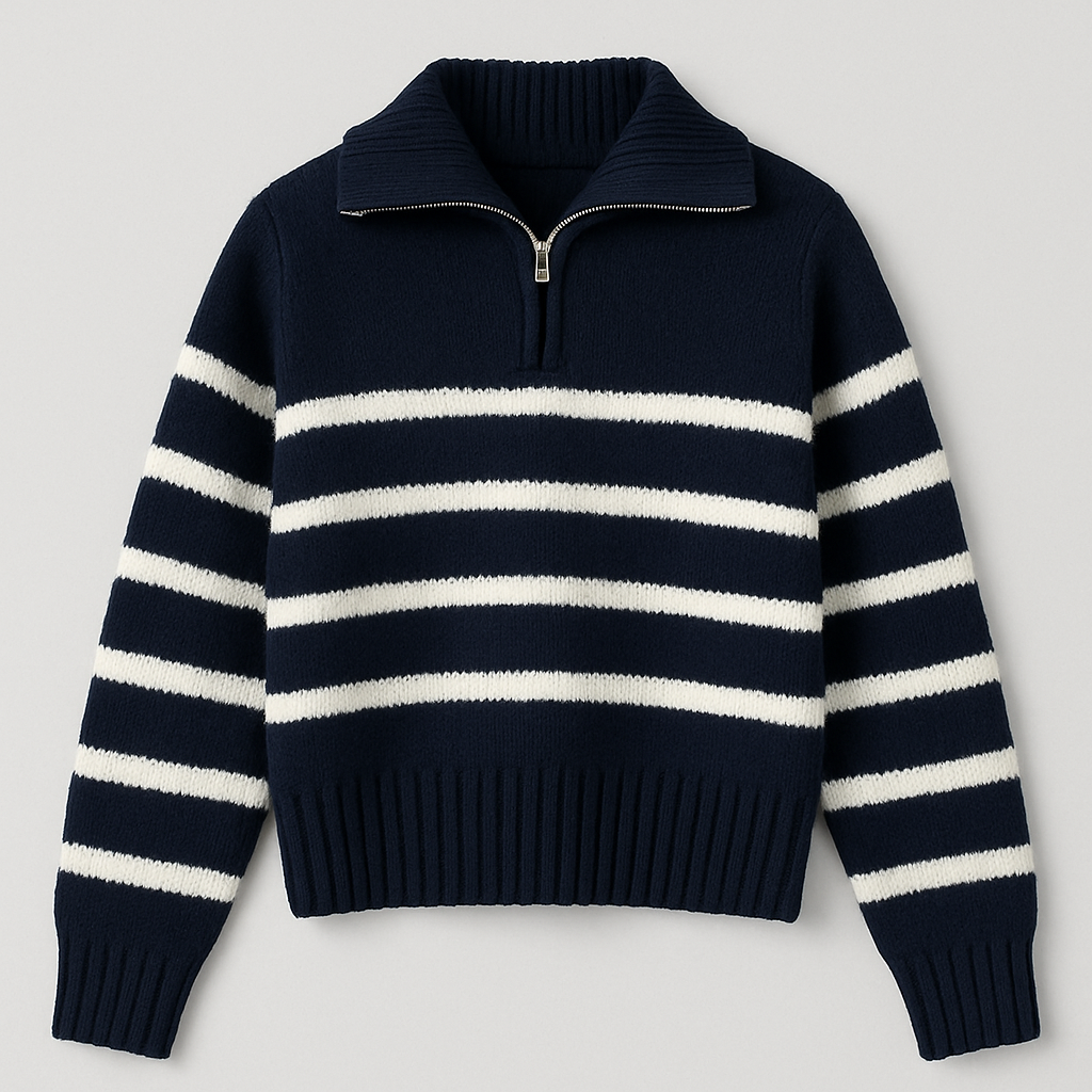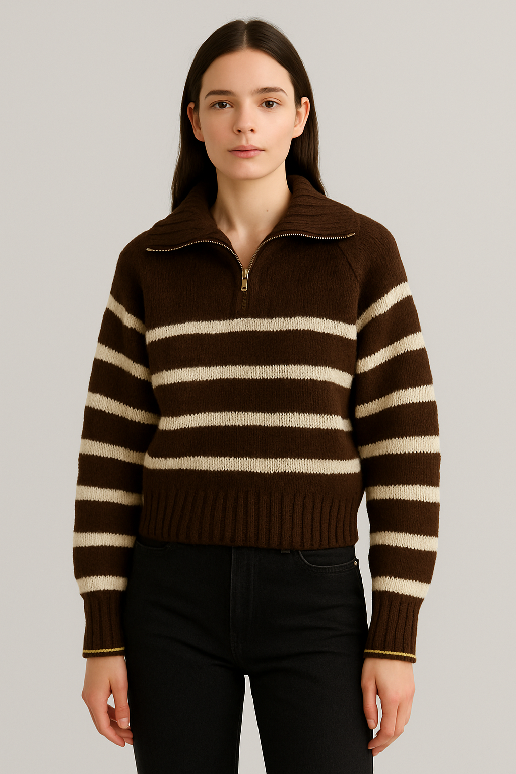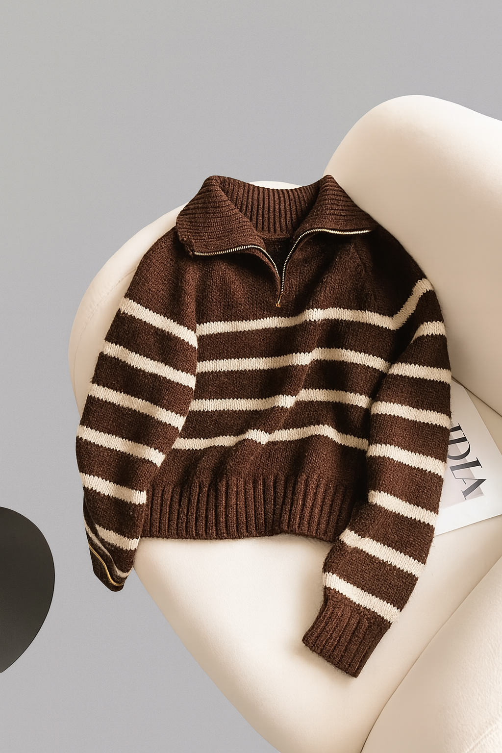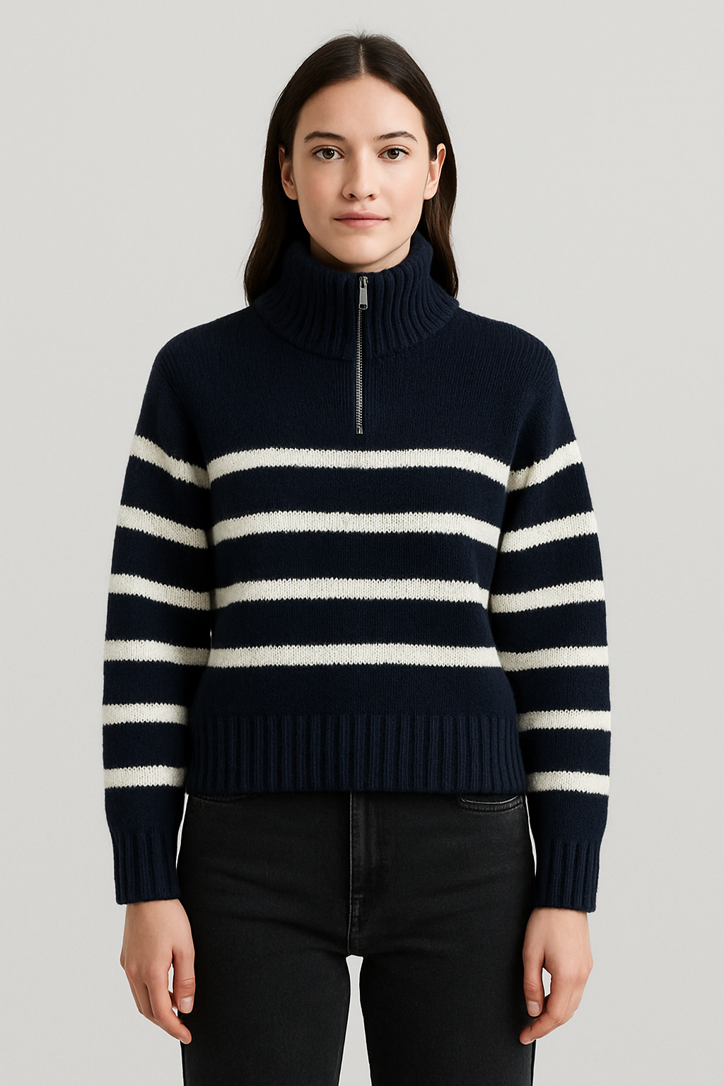 En stilren och mångsidig tröja som kombinerar klassiska ränder med modern komfort. Denna stickade tröja i svart och vitt är tillverkad av ett mjukt, stretchigt material som ger en avslappnad men ändå elegant passform.