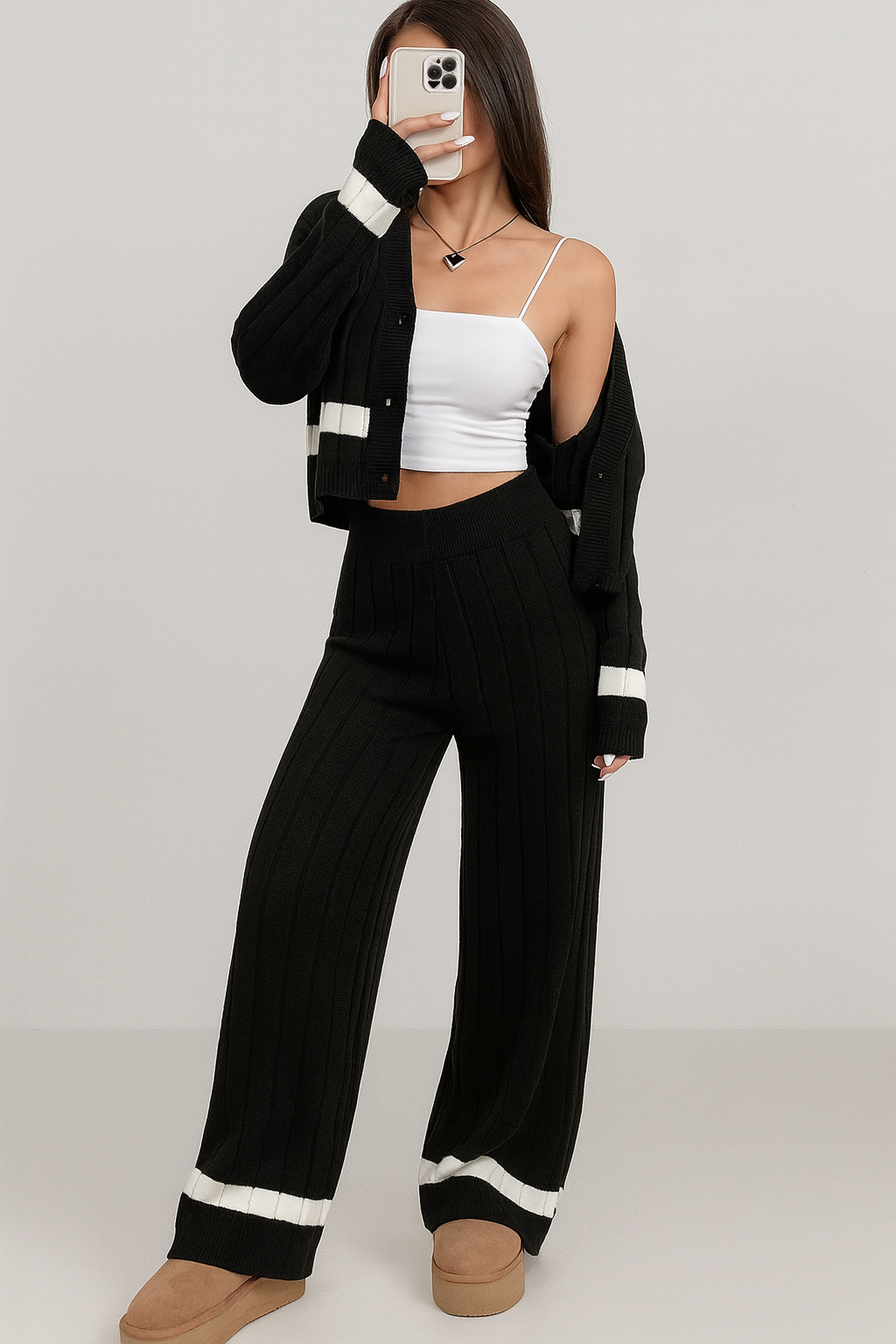 Det mjuka materialet och den stilrena färgblock-designen gör detta set till ett självklart val i garderoben under höst och vinter. Bär plaggen tillsammans för en komplett look eller matcha dem separat för fler stylingmöjligheter.