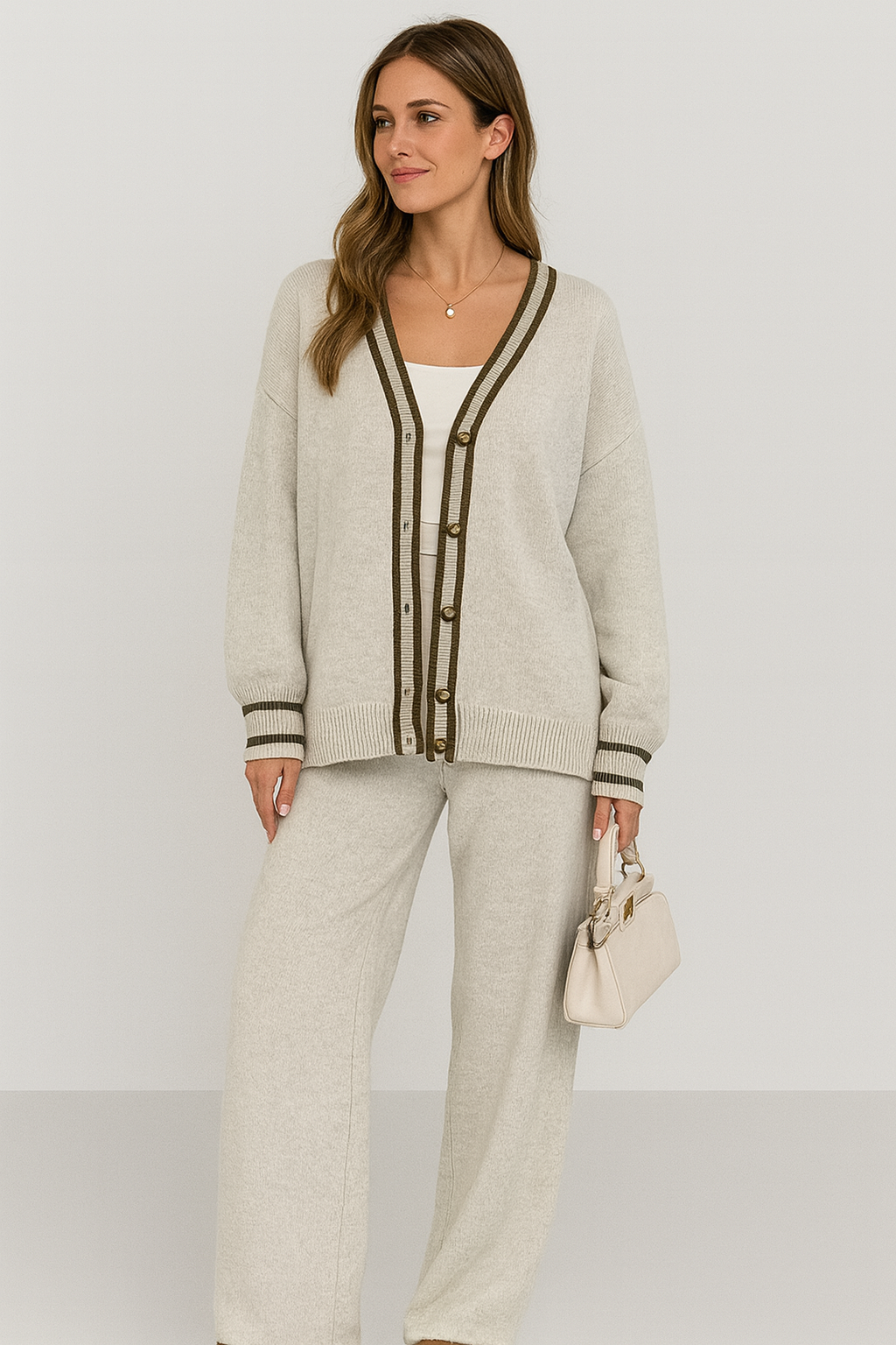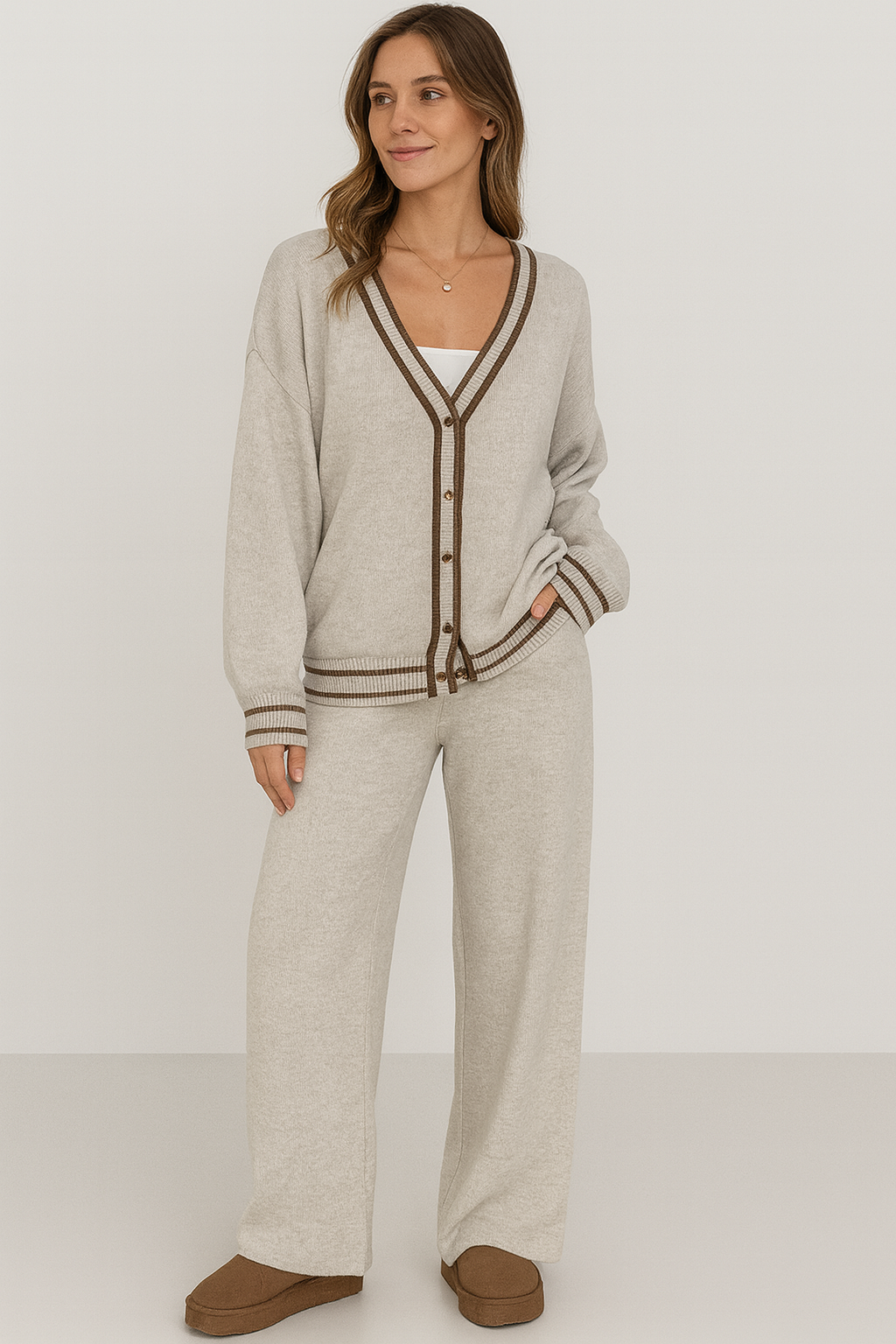 Tvådelat set i avslappnad passform Upplev den perfekta kombinationen av stil och komfort med detta eleganta tvådelade set. Setet består av en mjuk kofta med V-ringning och knappar samt matchande högmidjade byxor i en löst sittande passform. Det tidlösa designen gör det enkelt att bära både tillsammans och separat – perfekt för både vardag, arbete och avslappnade tillfällen. Detaljer: Tvådelat set: kofta och byxor V-ringad kofta med knäppning Högmidjade byxor i avslappnad passform Bekvämt och mjukt tyg