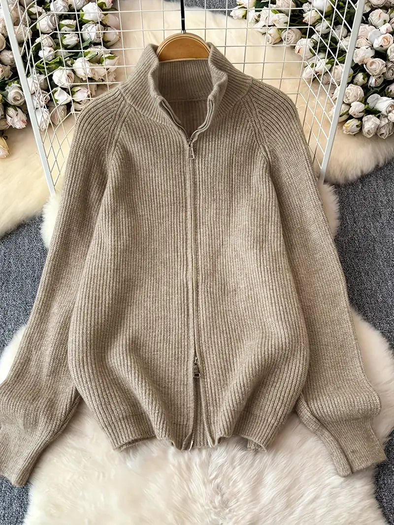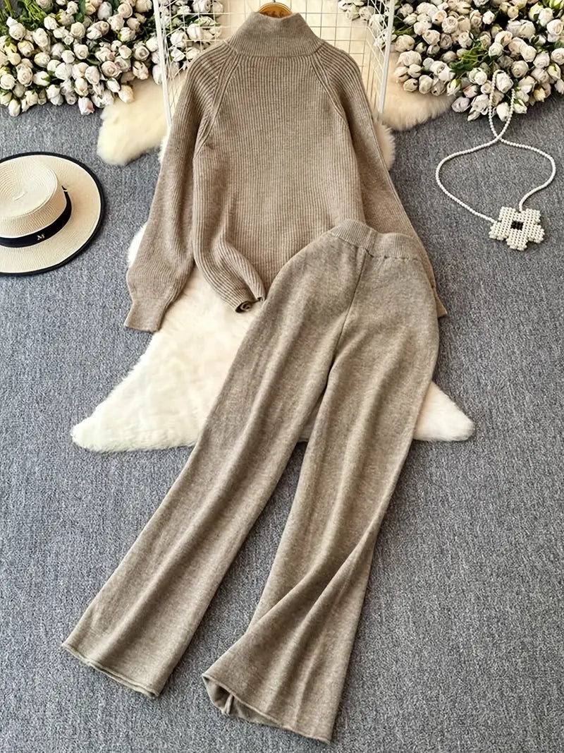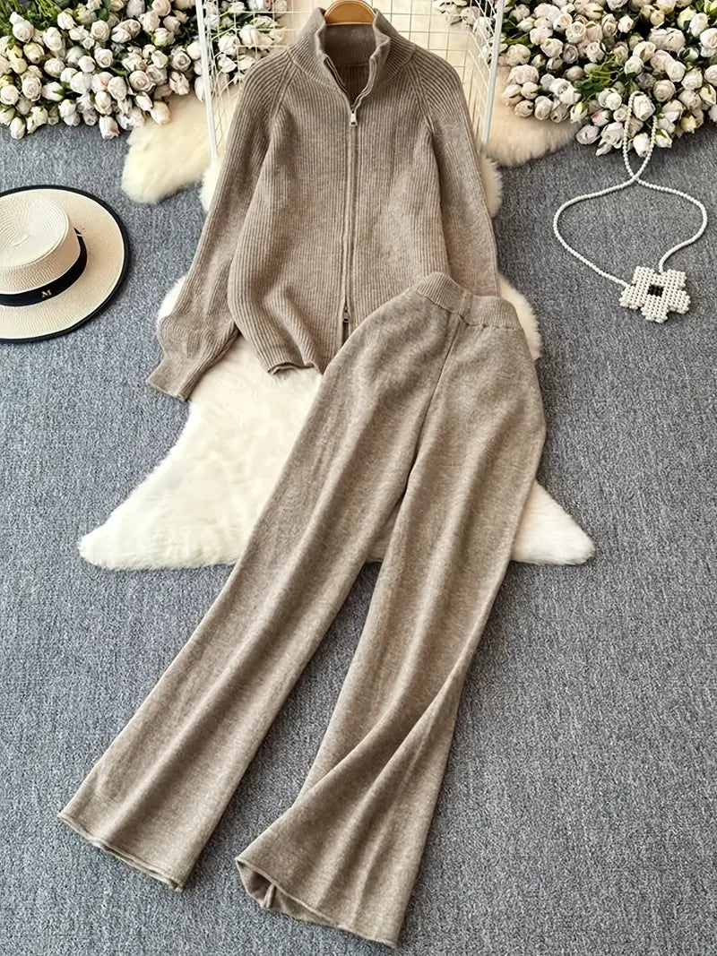 Det mjuka, stickade tyget känns underbart bekvämt och faller smidigt runt kroppen. Tack vare dragkedjan och den klassiska kragen utstrålar koftan enkelhet och klass, medan de vida byxorna tillför en modern och elegant touch.