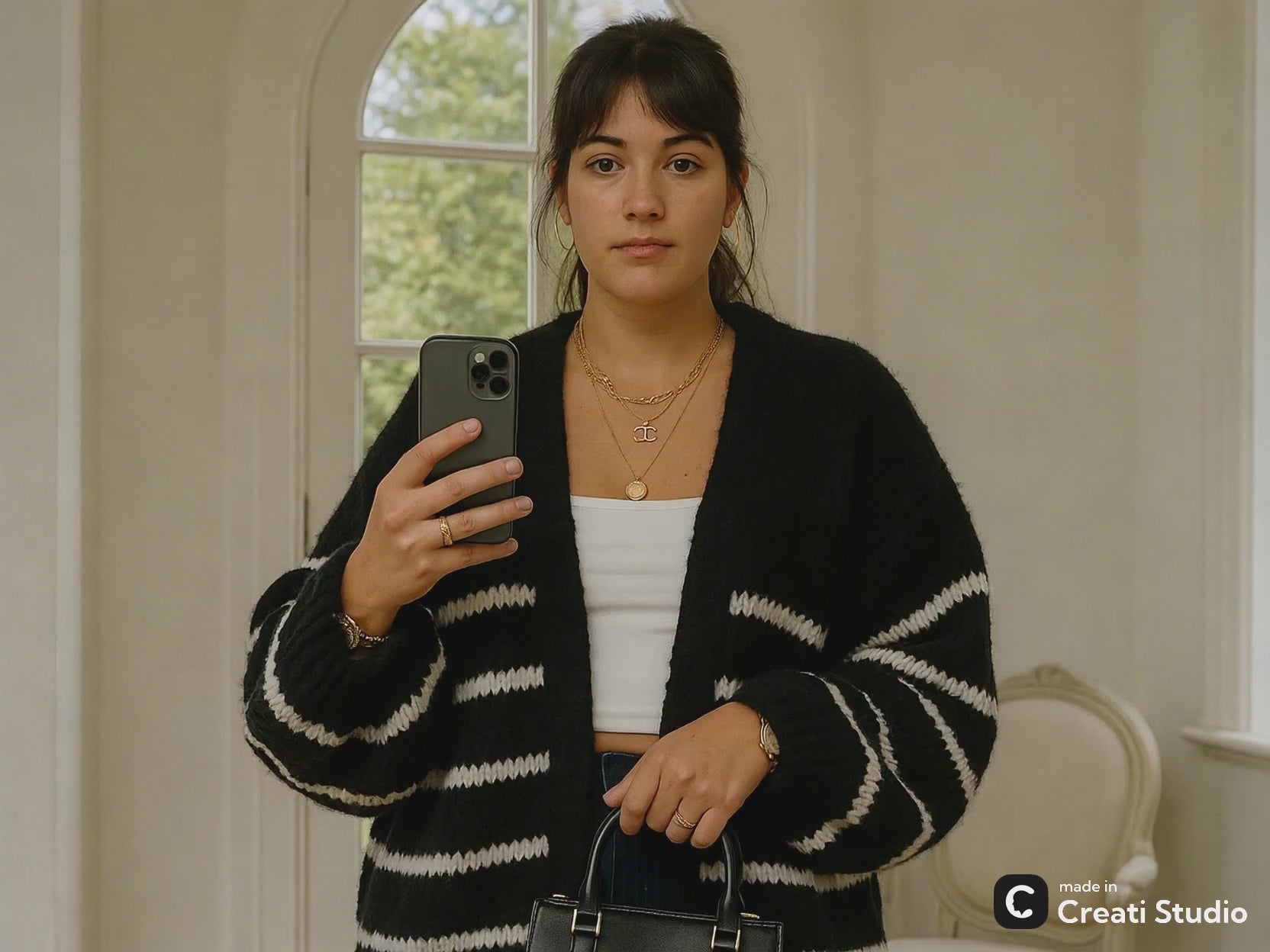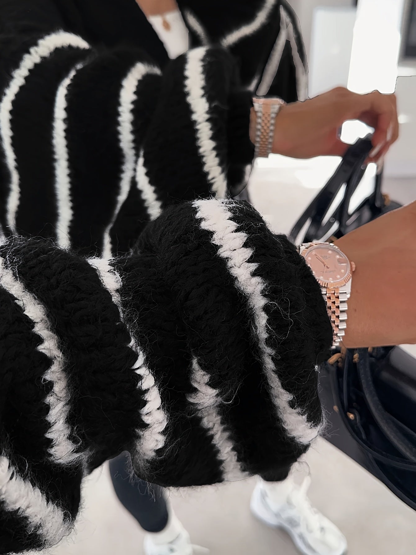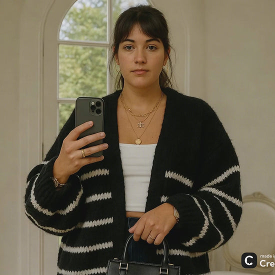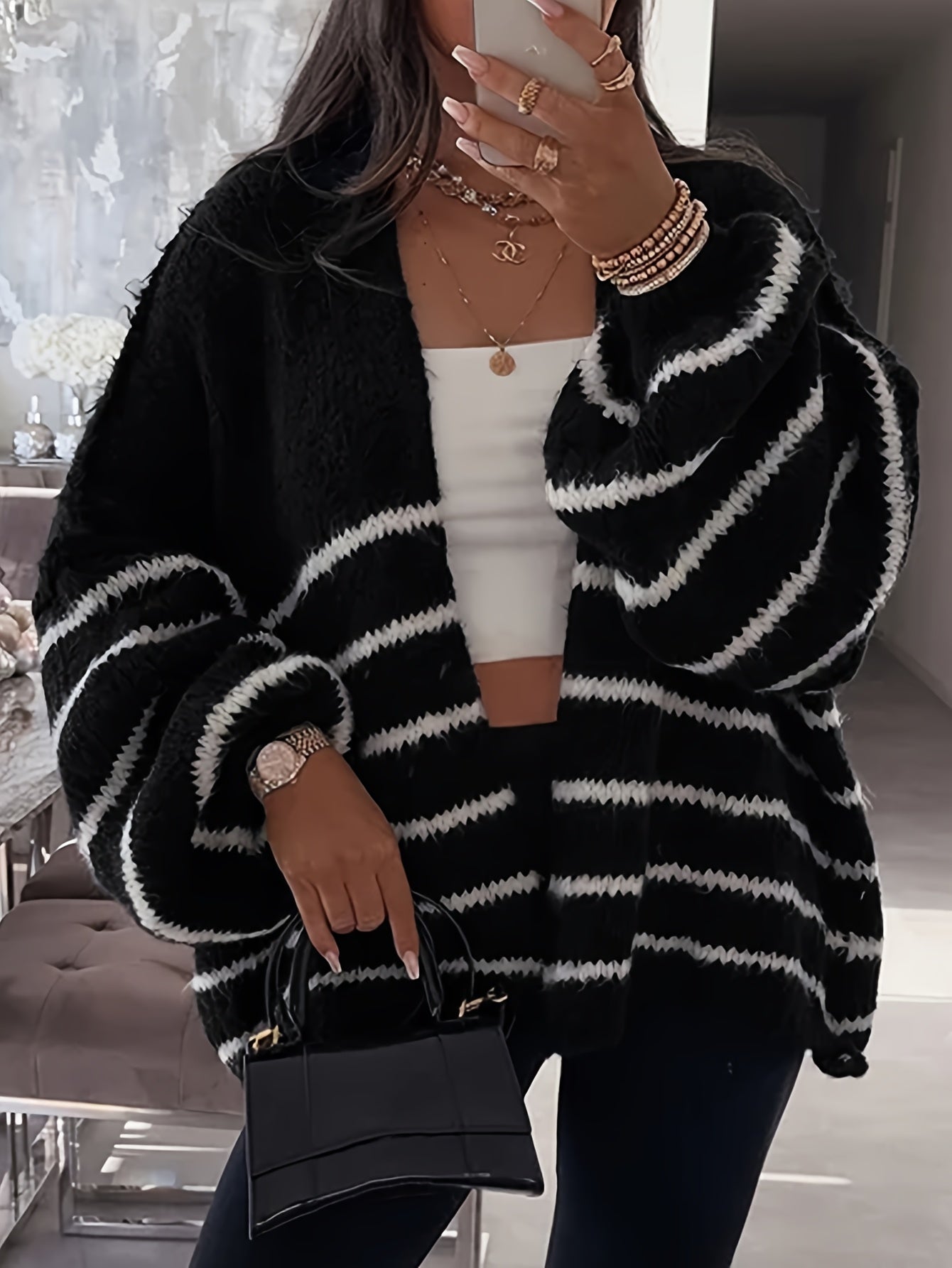 Denna stilfulla damkofta kombinerar ett tidlöst randigt mönster med en elegant V-ringning och en mjuk, bekväm textur. Tack vare den mångsidiga designen passar koftan både till vardagliga och formella tillfällen. Bär den som ett extra lager under svala höst- och vinterdagar, eller styla den som en chic lagerjacka för kontoret eller en utekväll.